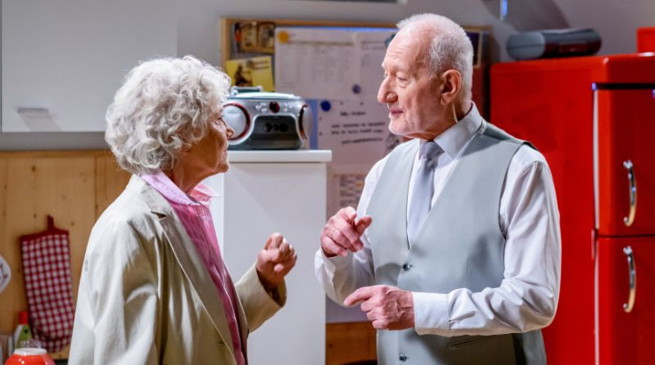 Vor Hildegard (Antje Hagen, l.) blickt Alfons (Sepp Schauer, r.) vorfreudig der Ankunft seines Enkels entgegen.