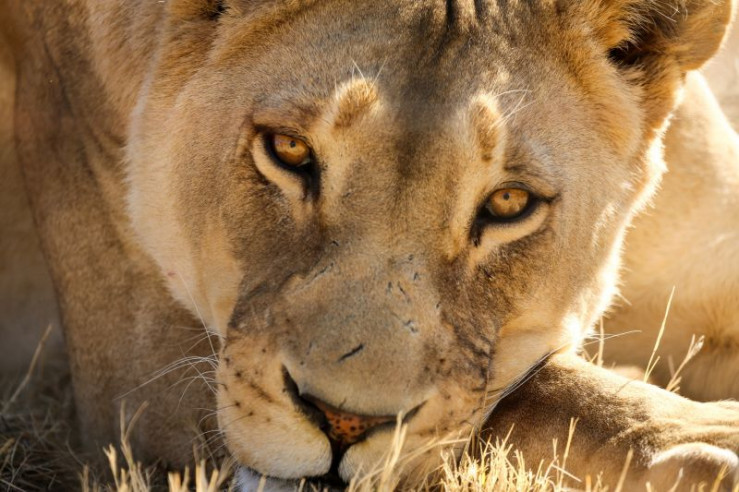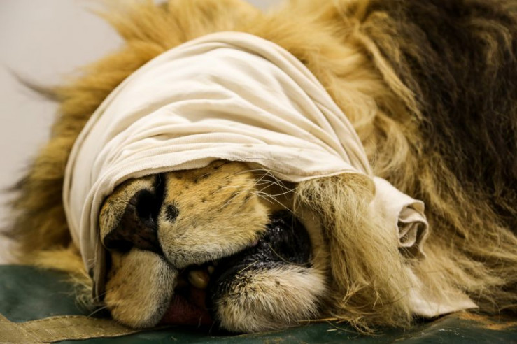Der mächtige Löwe 'Kongo' in Vollnarkose vor einer Zahn-OP. Die Augen sind dabei geöffnet, daher wird als Lichtschutz für die Augen ein Tuch über den Löwenkopf gebreitet.
