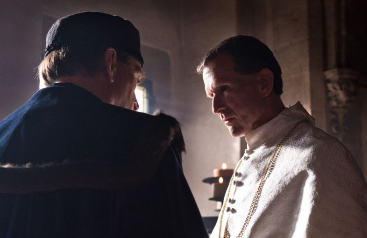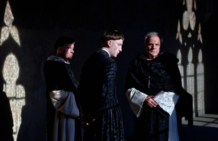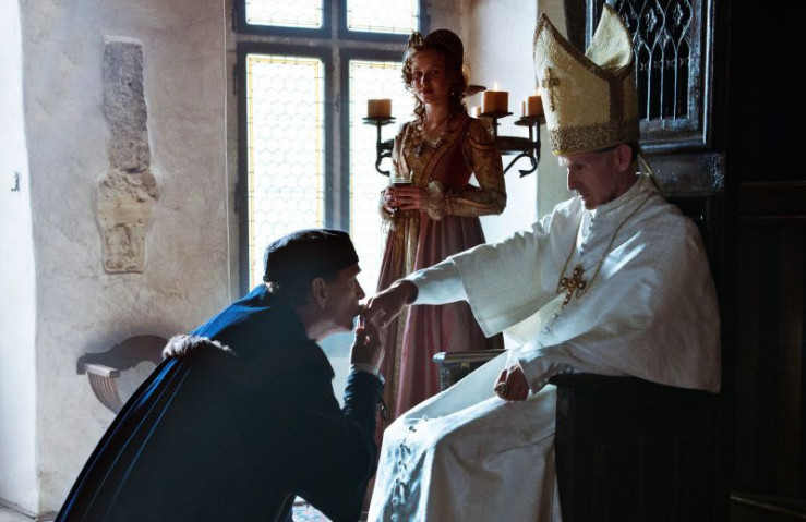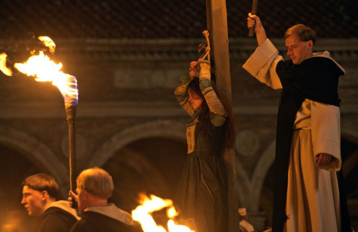 Heinrich Institoris (Philipp Moog, r.) ist ein religiöser Eiferer. Völlig besessen von seiner Vorstellung, dass Frauen das Werk des Teufels sind, ist er zu allem bereit, um die angeblichen Hexen zu vernichten. In Abt Torrani (Bernhard Schütz, l.) und Battista Nardini (Leonard Carow, Mitte) findet er Verbündete.