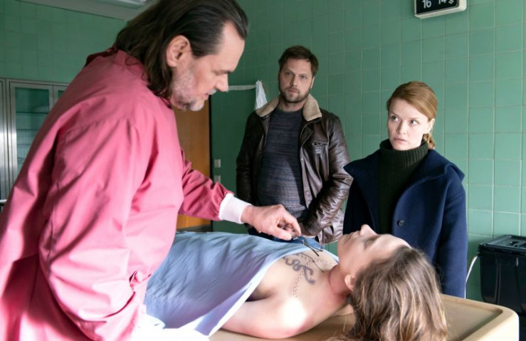 Ria Larsen (Karoline Schuch) und Mattern (Ronald Kukulies) sind gespannt auf die Obduktionsergebnisse von Bernhard Metzger (Markus John).
