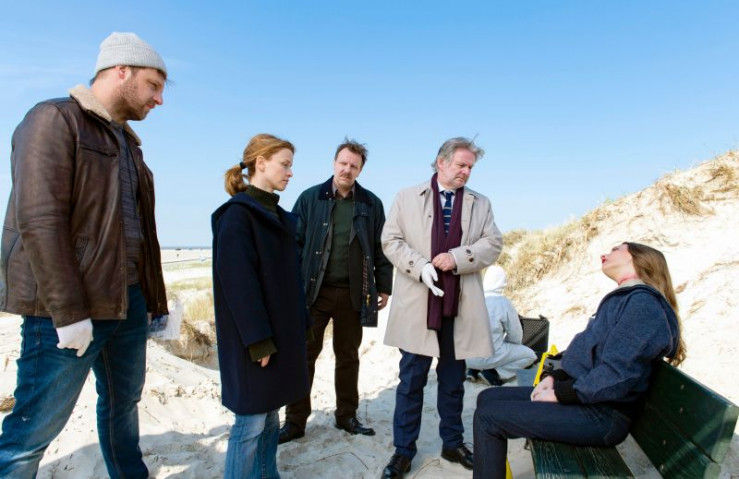 Ein Ritualmord: Polizeichef Bergmann (Max Herbrechter, 2. v. re.), Ria Larsen (Karoline Schuch), Brandt (Christoph Letkowski, l.) und Mattern (Ronald Kukulies) untersuchen die Frauenleiche.