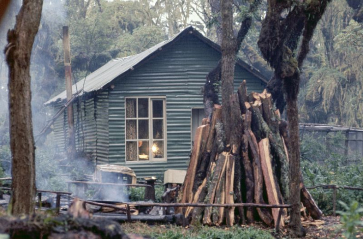 Dian Fossey in ihrer Hütte im Karisoke-Forschungszentrum, Ruanda