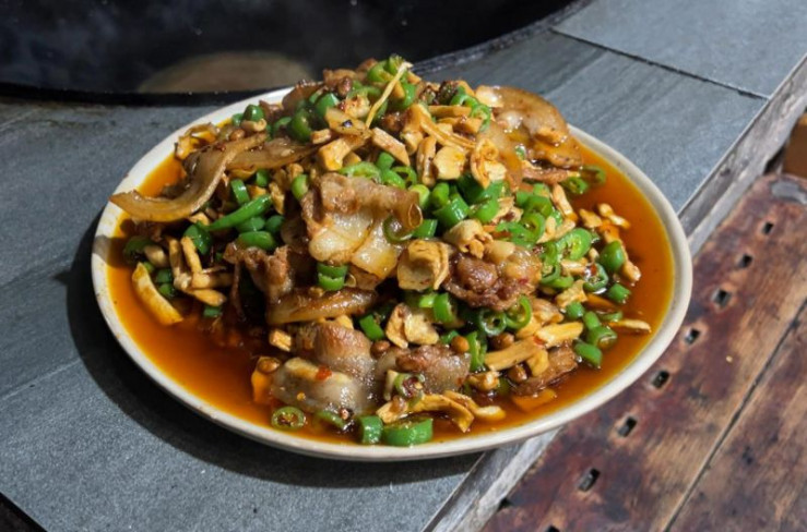 In China wird gebratenes Schweinefleisch mit getrockneten Radieschen serviert.