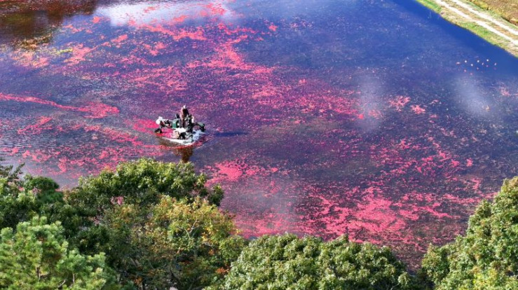 Farbenfrohes Spektakel: Für die Cranberry-Ernte werden die Felder geflutet, mit Hilfe von speziellen Mähdreschern schlagen die Farmer die Beeren von den Sträuchern.