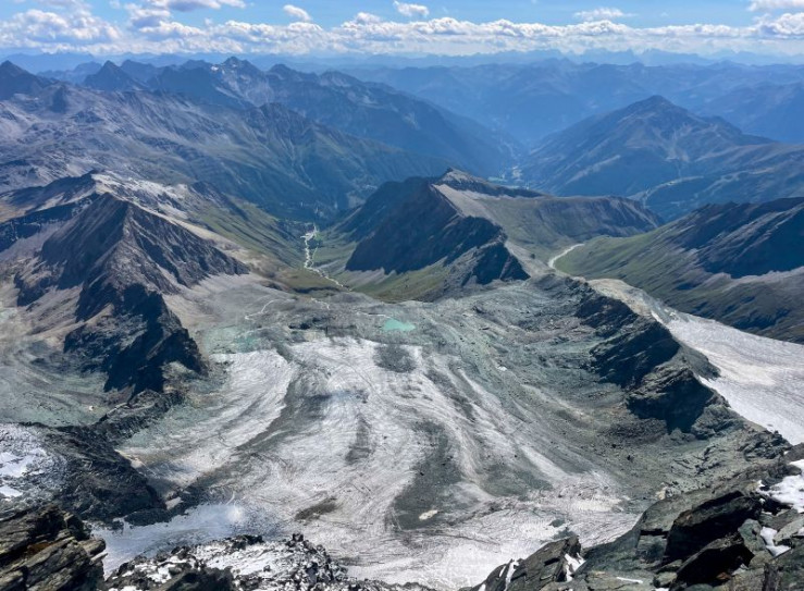 Felsstürze, Hangrutschungen, Gletscherschmelze und auftauender Permafrost im Hochgebirge - die Alpenregion ist einem drastischen Wandel unterworfen. Im Bild: Die Gletscherzone am Großglockner: Ein dramatischer Rückgang des Eises wird seit Jahren beobachtet. Die Gipfelbereiche waren früher das ganze Jahr im Eis.