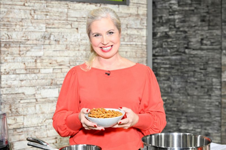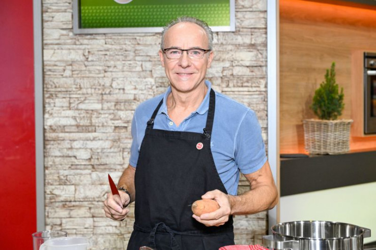 Gruppenfoto von links: Kandidaten Evelyn Bass, Sonja Dale, Roman Kadletz, Moderatorin Cornelia Poletto, Juror Richard Rauch, Kandidaten Eda Block, Felix Oltrogge und Torsten Woelpl