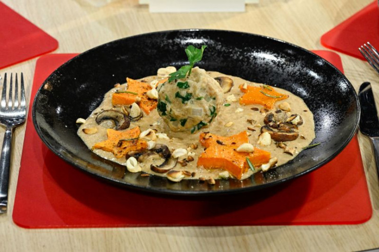 Vegetarisches Wintergericht: Semmelknödel mit Pilzrahm und gebackenen Kürbistalern von Sonja Dale