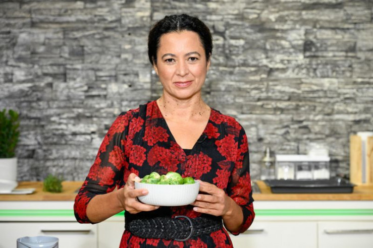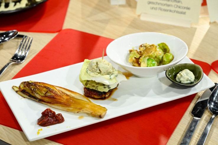 Vegetarisches Wintergericht: Portobello-Burger mit selbstgebackenem Thymian-Bun, Röstkartoffeln, geschmortem Chicorée und Rosenkohlsalat von Evelyn Bass