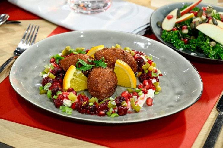 Vegetarisches Wintergericht: Bulgur-Bällchen mit Tofu-Walnuss-Zimt-Füllung, Cranberry-Dip und Grünkohlsalat mit Apfel von Eda Block