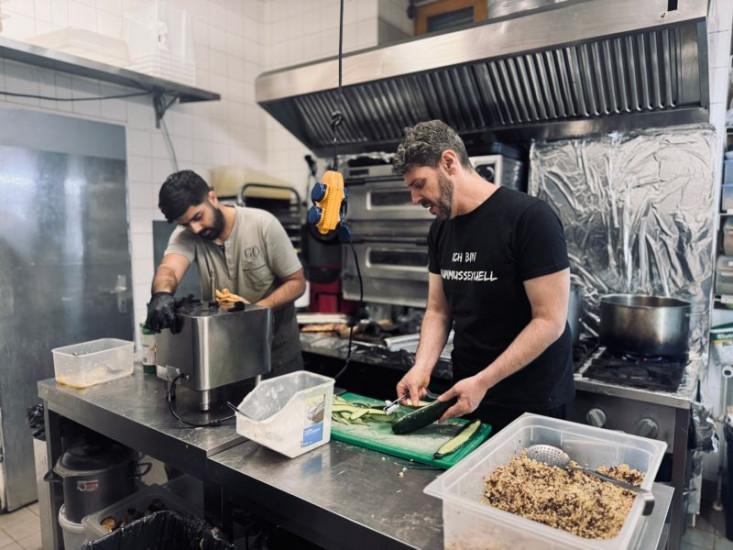 Der jüdische Israeli Oz Ben David (r.) zusammen mit einem pakistanischen Koch in der Küche seines Berliner Restaurants "Kanaan", das er gemeinsam mit seinem palästinensischen Geschäftspartner Jalil Dabit führt.