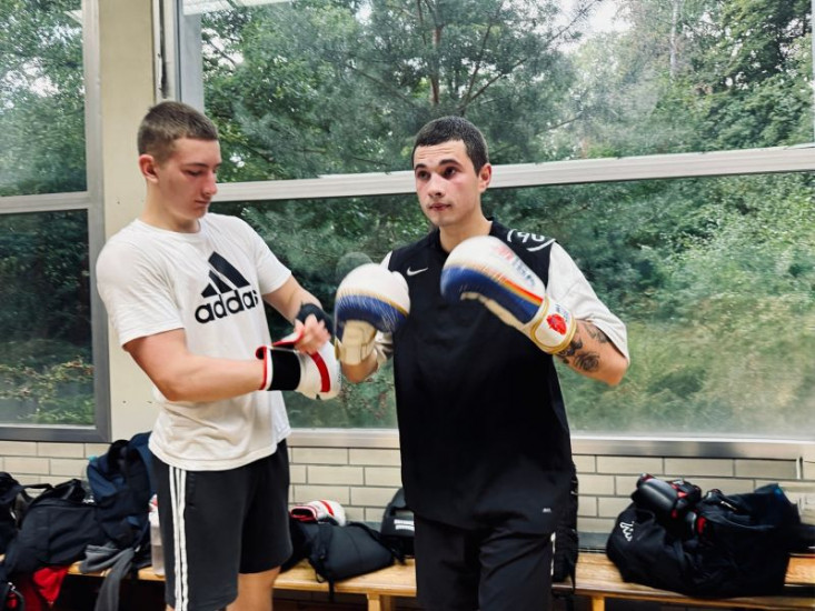 Der russischstämmige Boxer Vitali Litz (l.) und der ukrainische Kriegsflüchtling Sergej Mermis (r.) trainieren gemeinsam junge Boxer aus vielen Ländern.