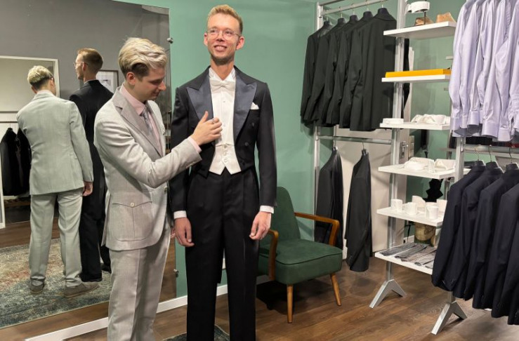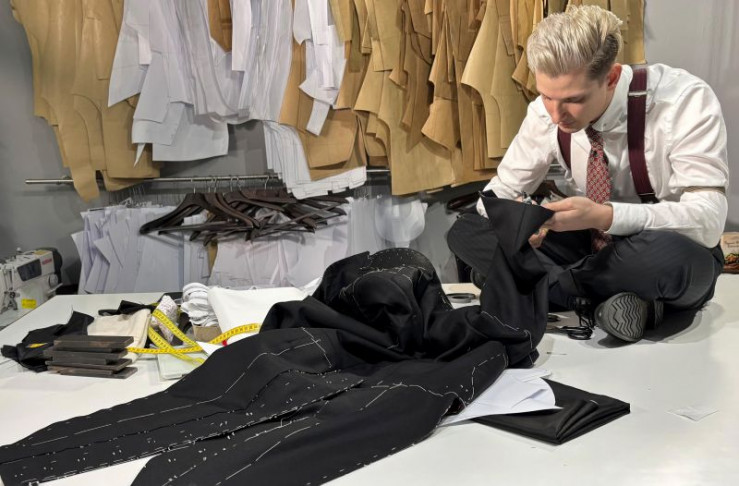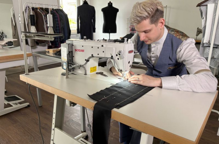 Herrenschneider Dominik Häusler aus Stuttgart bereitet Knopflöcher am Frack vor.