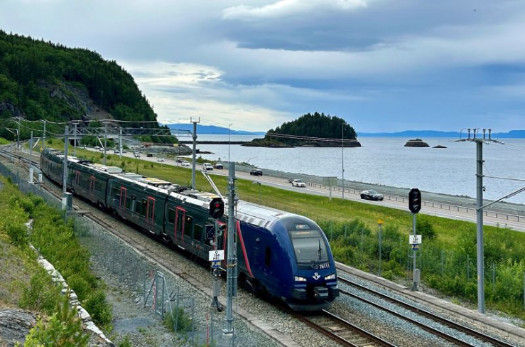Norwegen: Eine Regionalbahn fährt am Trondheimfjord entlang und nähert sich dem Bahnhof Hell.