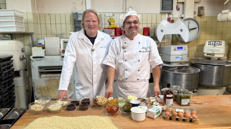 Oecotrophologin Anja Tanas (l) und Björn Freitag schauen sich das Weihnachtsgebäcksortiment ganz genau an.