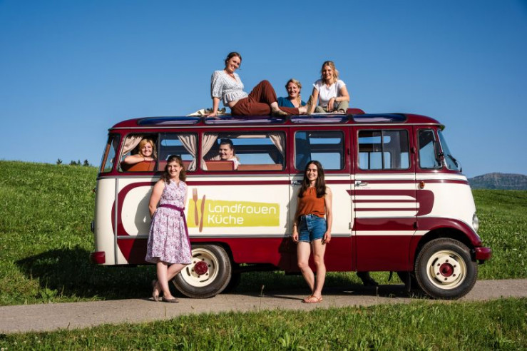 Alle Teilnehmerinnen der 17. Staffel von der "Landfrauenküche". Von links, vorne: Veronika Kirchmaier und Stefanie Weig; im Bus, von links: Franziska Herzing und Marina Laqua; auf dem Bus, von links: Petra Sollmann, Brigitte Hölzler und Teresa Nitzl.