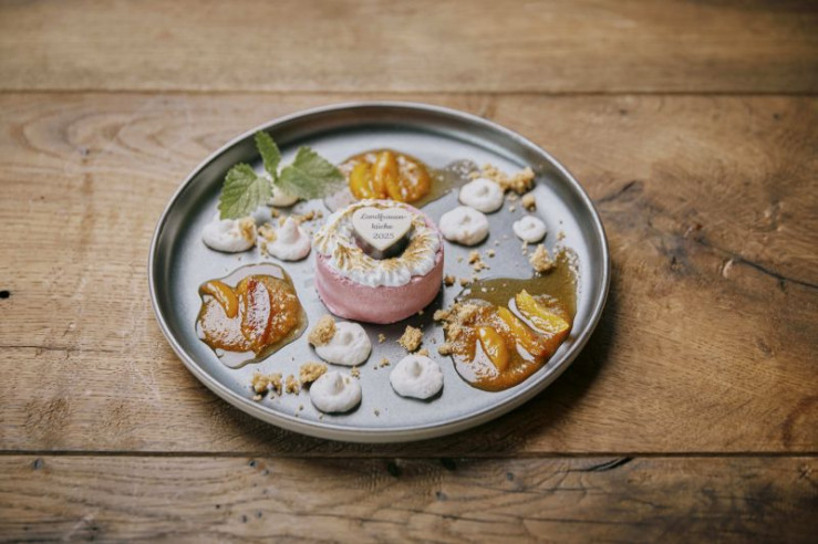 Dessert: "Beeren Parfait mit geflämmtem Baiser, glasierte Aprimira und Thymian - Butterstreusel mit Fleur de Sel".