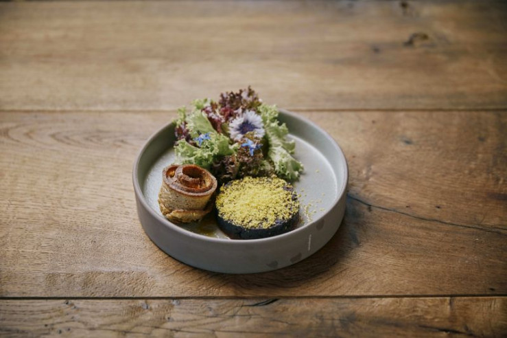 Gruß aus der Küche: "Lila Karottentatar mit gehobeltem Eigelb, Salate aus und um Feinschluck und Brotchip".