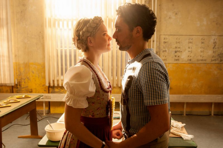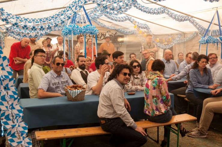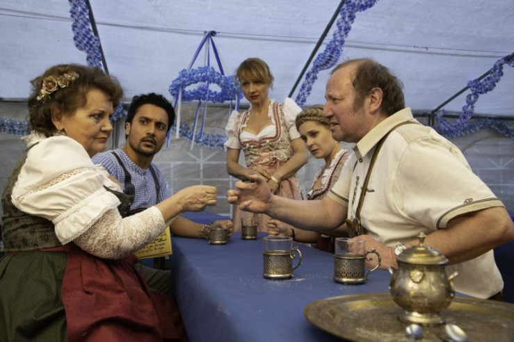 Die Mitarbeiter des Instituts tanzen Bayerische Volkstänze. Von links: Gmeiner (Rainer Reiners) mit Margarete (Swetlana Schönfeld), Jördis (Nadja Bobyleva) mit Haschim (Omar El-Saeidi) und Dr. Eckhart (Christina Große) mit Titus (Robert Stadlober).