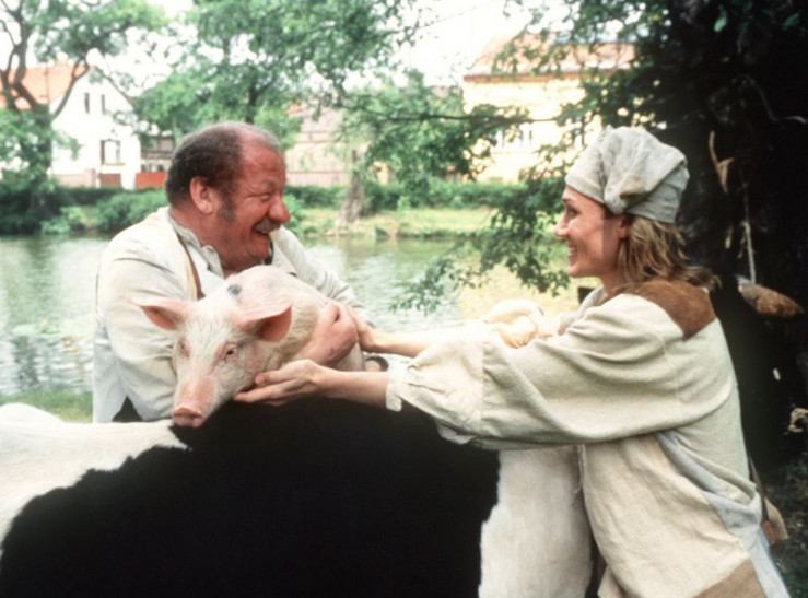 Tausche Kuh gegen Ferkel! In diesem Fall gibt der Bauer (Wolfgang Völz, links) natürlich gern sein Ferkel her. Aber auch Hans (Andreas Bieber) denkt, er macht ein Schnäppchen.