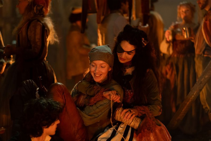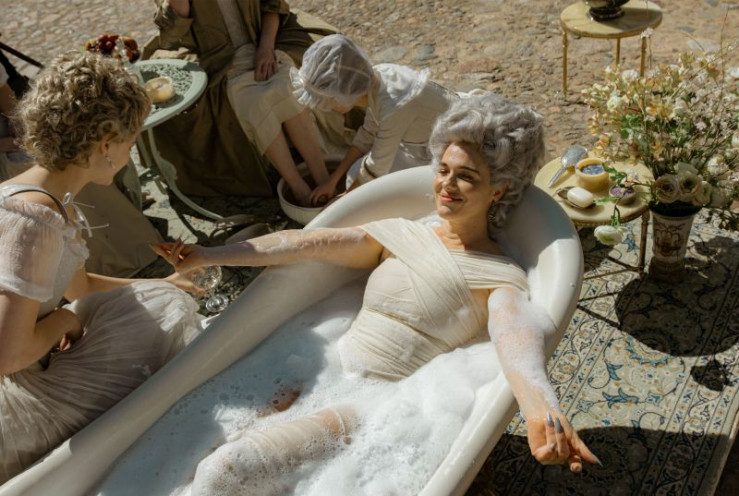 Königin Marie Antoinette (Verena Altenberger, r) lächelt Gräfin von Greiner (Lisa Vicari) an, während sie in einer Badewanne voll Eselsmilch liegt.