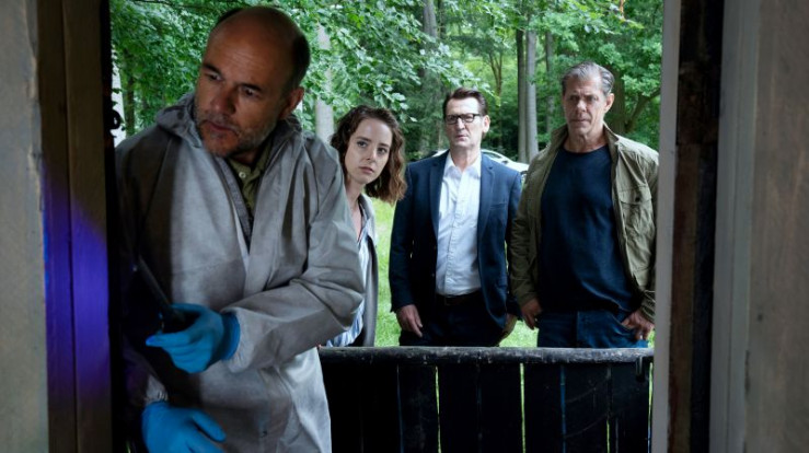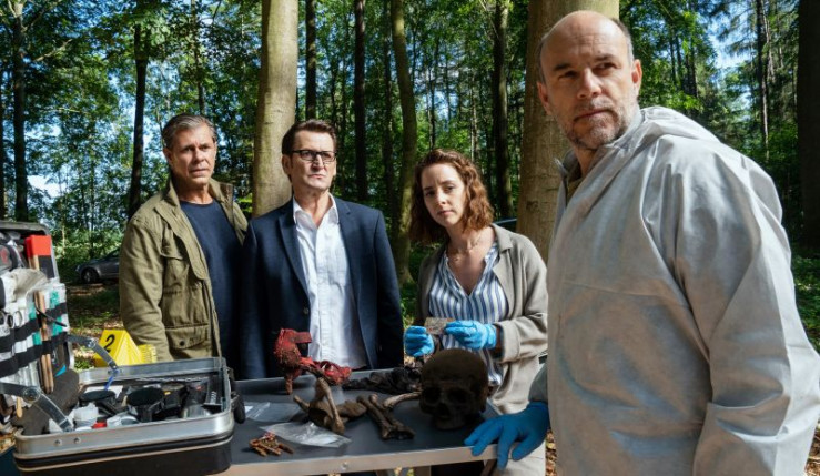 Lars (Ingo Naujoks, 2.v.l.), Finn (Sven Martinek, 2.v.r.) und Tomke (Anjorka Strechel, r.) erste Ermittlungsergebnisse aus.