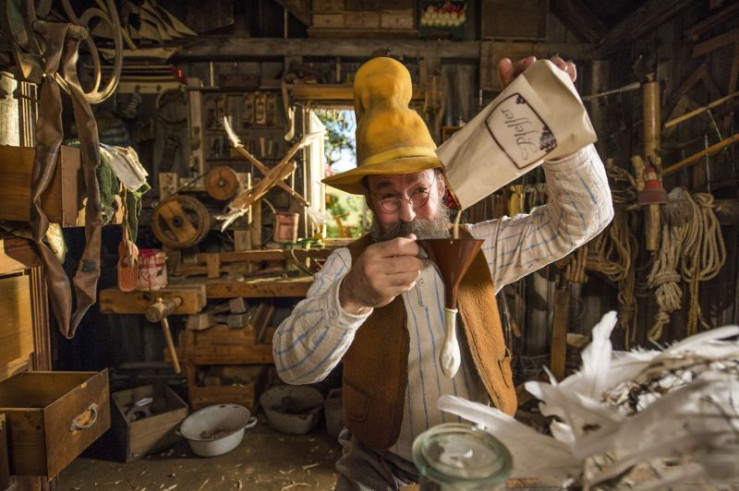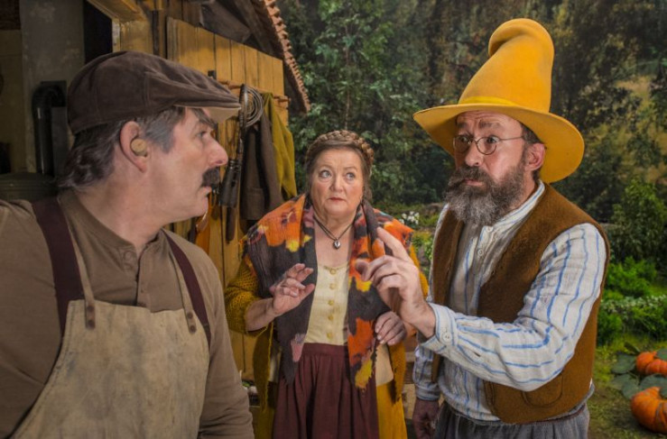 Pettersson (Ulrich Noethen, re.) versucht Gustavsson (Max Herbrechter, li.) davon abzubringen, dass der Hahn im Suppentopf landet. Beda (Marianne Sägebrecht) hört zu.