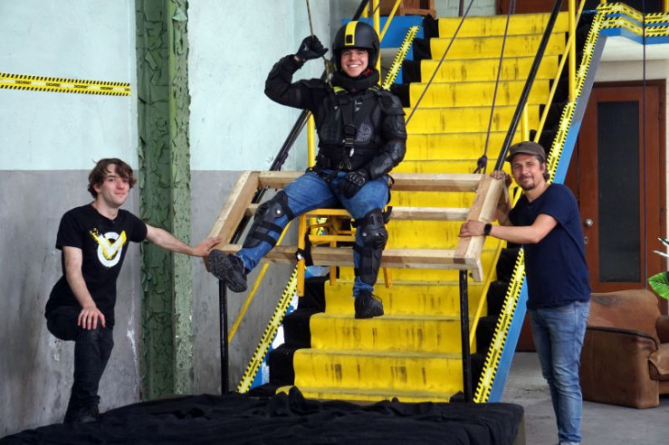 Die Treppe zu lang und wieder zu spät an der Tür? Tommy und das Testteam experimentieren mit Sportgeräten, Möbelstücken, Sackkarre und Bügelbrett dieses Problem zu lösen. Schutzausrüstung ist bei diesen Tests ein Muss.