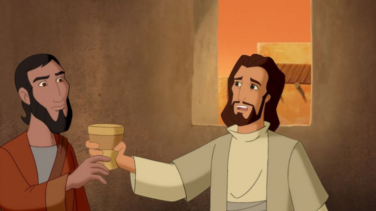 Jesus reicht seinem Jünger den Rotweinkelch zum letzten Abendmahl.