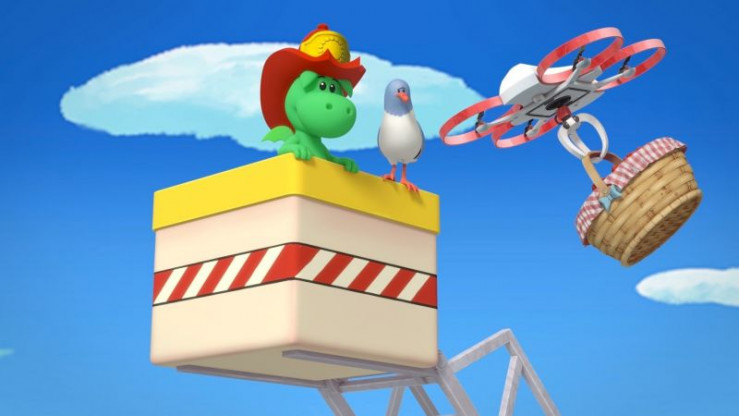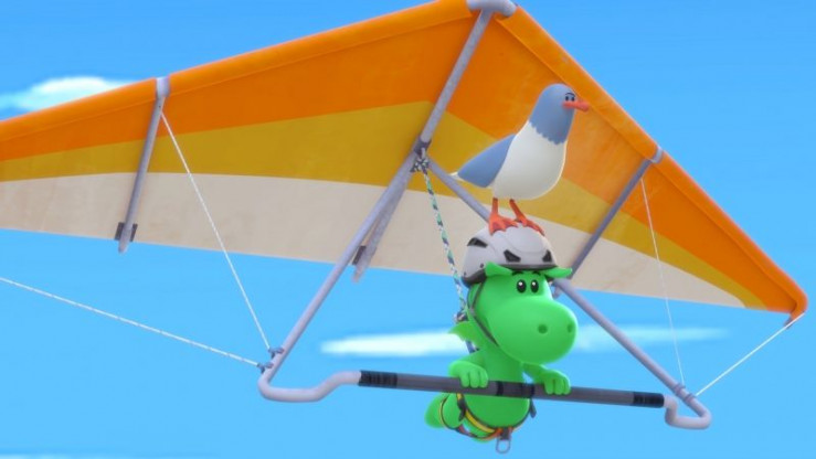 Grisu, der kleine Drache, will mit einem Flugdrachen einer Möwe das Fliegen beibringen.