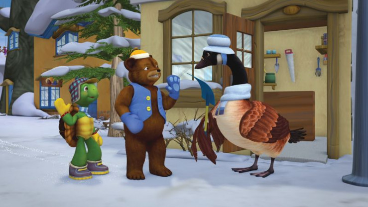 Franklin und Bär bieten Frau Gans ihre Hilfe beim Schneeschaufeln an.