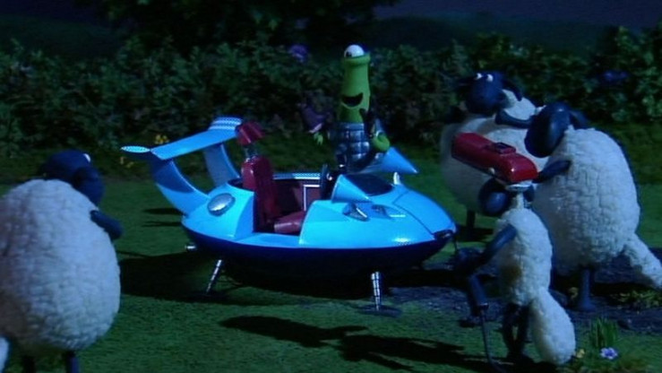 Shaun und Co werden des Nachts von einem seltsamen Geräusch und grünem Licht geweckt. Draußen entdecken sie eine notgelandete fliegende Untertasse aus der ein einäugiger Außerirdischer aussteigt. Bitzer, ganz Wachhund, läuft bellend auf ihn zu. Der Außerirdische hat ein Gerät, das ihm verrät, wie er Bitzer los wird: Er wirft ein Stöckchen und schon ist der Hund über alle Berge. Shaun und seine Freunde haben keine Angst vor dem Fremden. Sie helfen ihm, sein Gefährt wieder klar Schiff zu machen. Doch Abheben will die fliegende Untertasse nicht, es fehlt Treibstoff. Shaun bringt Benzin, das funktioniert nicht. Auch Kohle und Batterien bringen das Raumschiff nicht in Bewegung. Dank seines Scanners findet der Außerirdische heraus, was auf Erden der richtige Treibstoff für sein Gefährt ist: Schaf-Fladen. Glücklich bedankt sich der Mann aus dem All bei den Schafen für den Treibstoff und fliegt davon. Als Bitzer mit seinem Stöckchen endlich zurückkommt ist alles beim Alten.