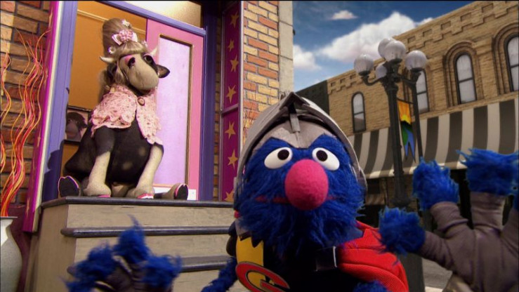 Super-Grobi hilft einer Kuh beim Treppensteigen und Elmo und Olli Dittrich erklären das Wort "imitieren".