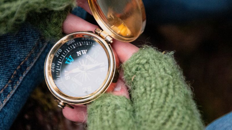 Luca versucht, sich mithilfe eines Kompasses zu orientieren.