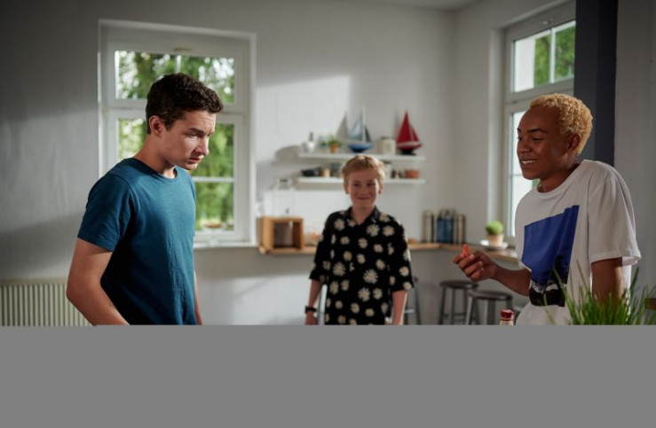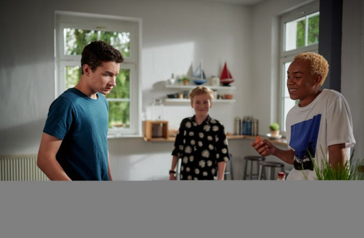 Sirius (Niels Krommes) entwickelt einen knackigen Plan in Sachen gesunde Ernährung, den er an Hermann (Thorin Holland, l.) und Pawel (Noel Okwanga, r.) testet.