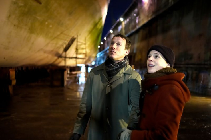 Marie (Bernadette Heerwagen, r.) zeigt Leo (Wotan Wilke Möhring, l.) ein Schiff im Trockendock.