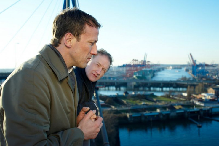 Auf der Köhlbrandbrücke erzählt Wolfgang Piehl (Falk Rockstroh, hinten) Leo Schreiber (Wotan Wilke Möhring, vorne) von den bevorstehenden Entlassungen.