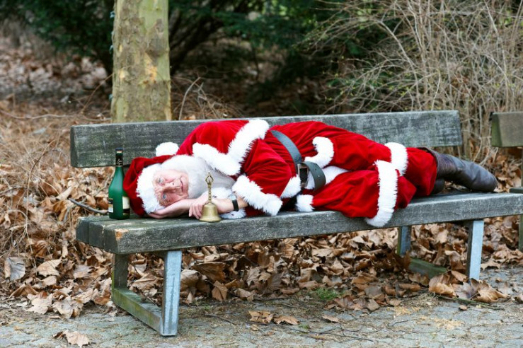 Der betrunkene Weihnachtsmann (Rolf Becker) schläft auf einer Parkbank.