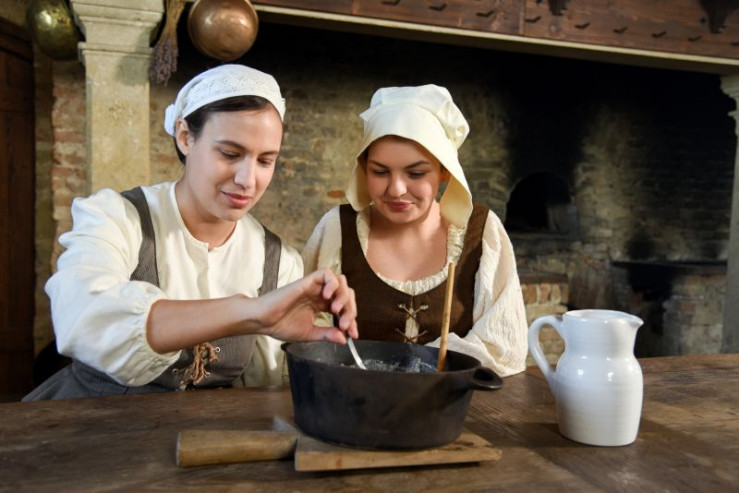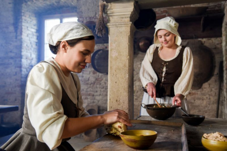 Mägde bei den Vorbereitungen der Speisen für das Festmahl der Herrschaften.