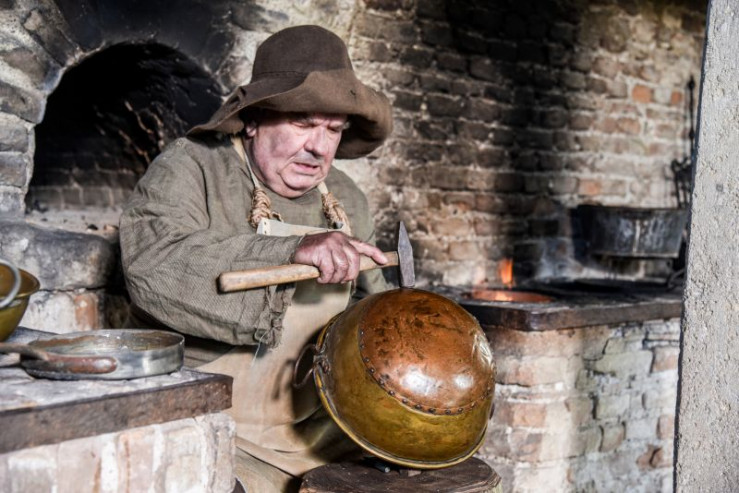 Der Kesselflicker dabei die teuren Töpfe der Adelsfamilie zu reparieren.