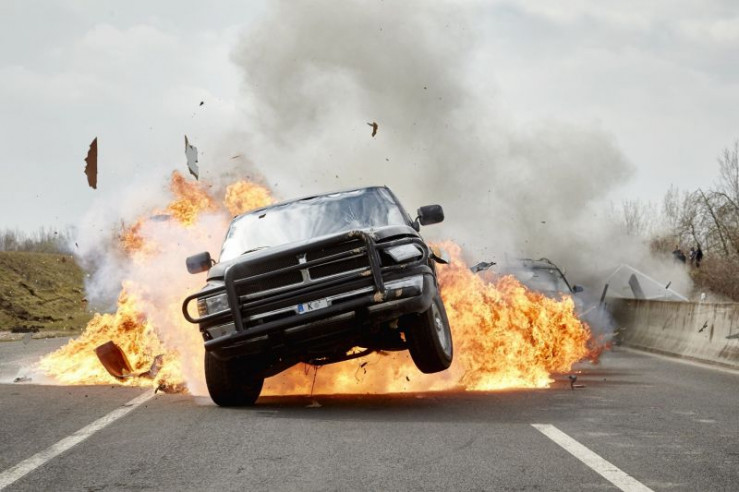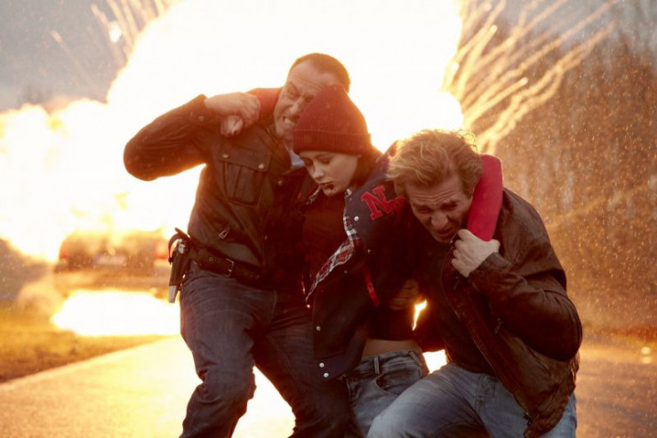 Semir (Erdogan Atalay, l.) und Paul (Daniel Roesner, r.) können Lisa (Mercedes Müller) in letzter Sekunde aus dem explodierenden Fluchtwagen retten...