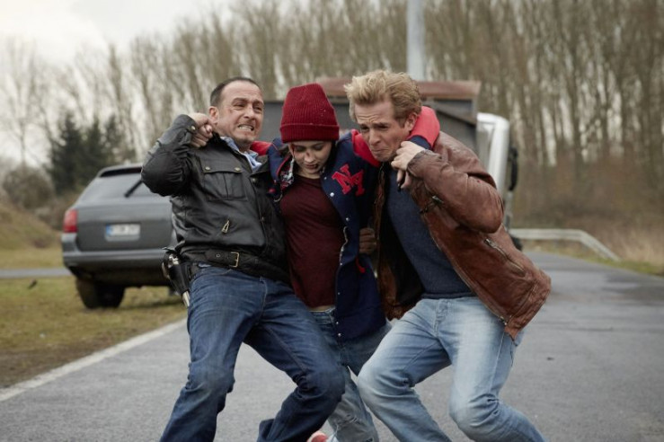 Nach ihrem missglückten Fluchtversuch wird Taschendiebin Lisa (Mercedes Müller) von Semir (Erdogan Atalay, M.) und Paul (Daniel Roesner) festgehalten und befragt.