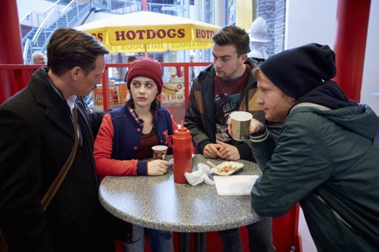 V.l.: Marco (Patrick Kalupa) trifft sich mit Lisa (Mercedes Müller), Arnold (Louis Huselstein) und Max (Paul Falk) zur Krisensitzung.