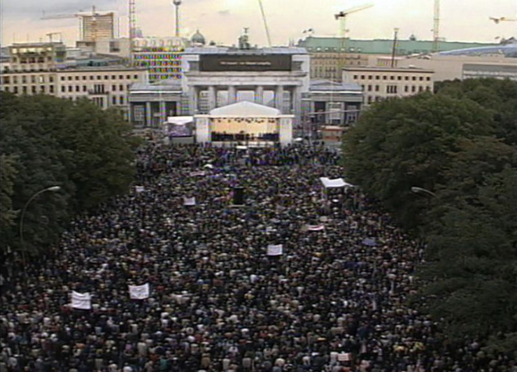 Das Jahr 2001 - die Terroranschläge des 11. September bringen auch das Berliner Leben zum Stillstand, Klaus Wowereit wird Regierender Bürgermeister und mit der Einweihung des neuen Bundeskanzleramts wird der Regierungsumzug nach Berlin abgeschlossen. Eine Berlin-Chronik der Superlative: Fünf Jahrzehnte von 1961, dem Jahr des Mauerbaus, bis 2009 als Berlin eine Weltstadt im 21. Jahrhundert ist. - Gedenkkundgebung am Brandenburger Tor für die Opfer des Terroranschlages am 11. September.