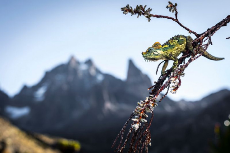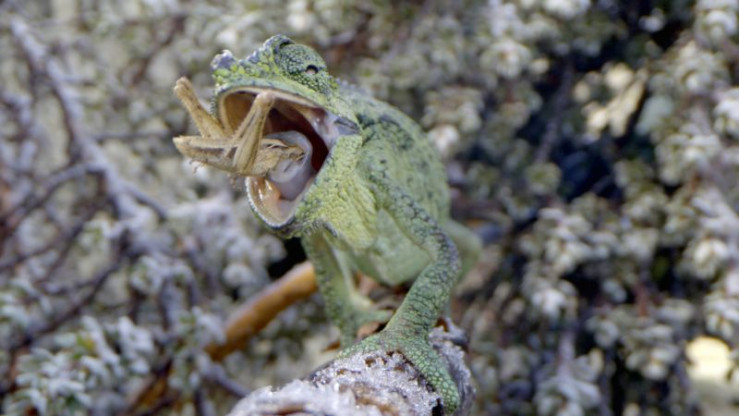 Um sich nach den eisigen Nachttemperaturen aufzuwärmen, sonnt sich ein Helmchamäleon an den hohen Hängen des Mount-Kenia-Massivs.