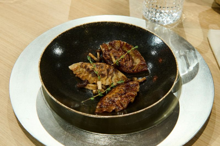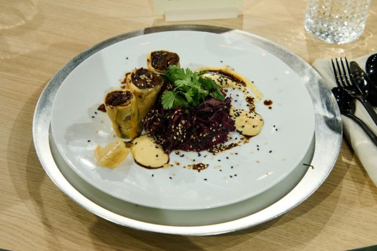 Tagesmotto: "Reste vom Feste": Mit Rinderragout gefüllte Frühlingsrolle, Rotkohl-Ingwer-Salat, Rotkohlcreme und Miso-Mayonnaise von Tarik Rose