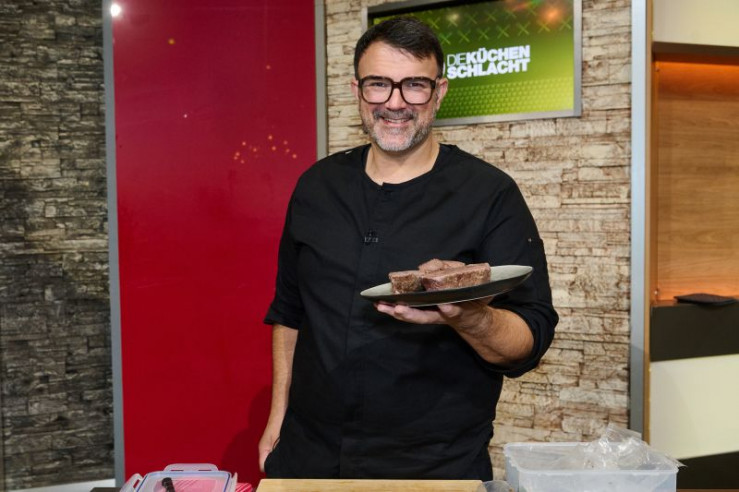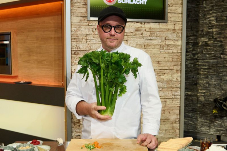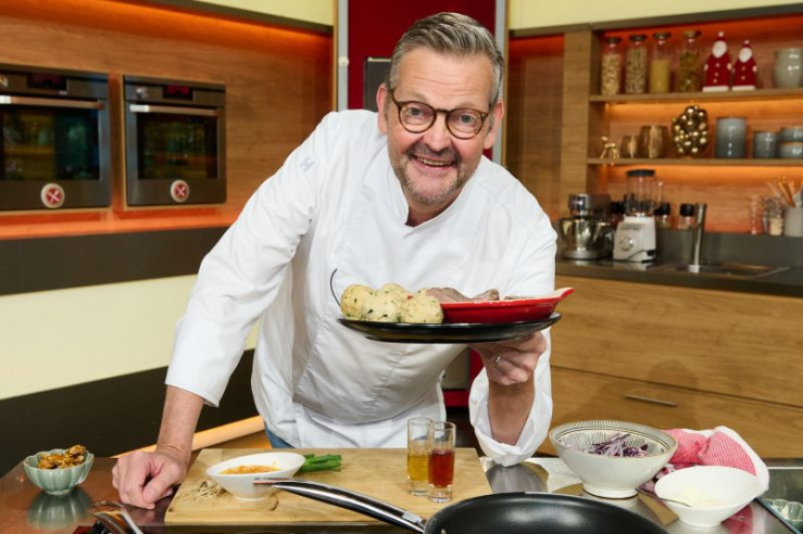 Gruppenfoto von links: Köche Thomas Martin, Tarik Rose, Cornelia Poletto, Moderator Johann Lafer und Koch Max Strohe