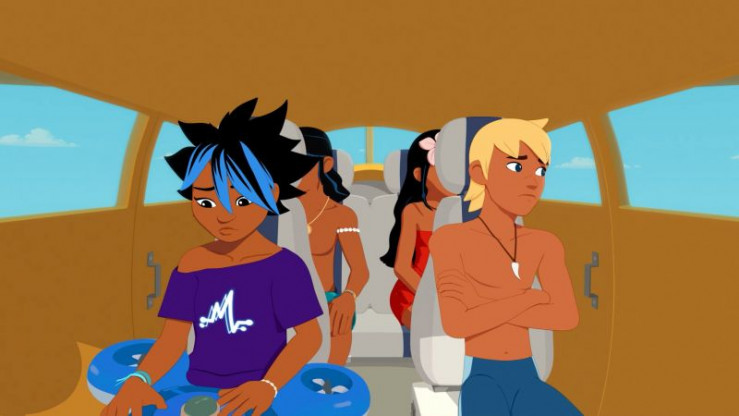 Yann (r.) ist sauer auf Maimiti (l.). Nur wegen ihrer Erfindung ist Zoom nun in Not. Auru (2.v.l.) und Timeti (2.v.r.) halten sich aus dem Streit heraus.