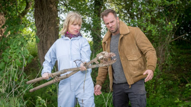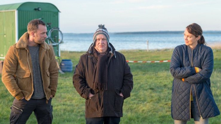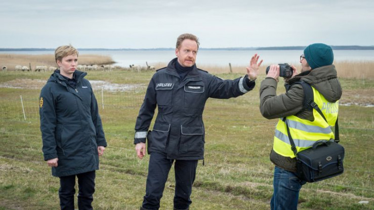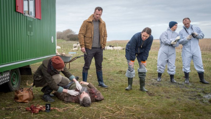 Auf der Schafsweide macht Reporter Richard Lister (Thilo Hermann, r.) ungefragt Fotos vom Tatort. Timmermann (Mathias Junge, M.) fordert ihn auf, dies sofort zu unterlassen. Austauschpolizistin Stine (Sidsel Hindhede, l.) unterstützt ihn dabei. Lister behauptet, gehört zu haben, ein Wolf habe den Schäfer getötet. Kein Kommentar! Was der Reporter zu diesem Zeitpunkt allerdings noch nicht weiß: Erste Indizien sprechen sehr wohl dafür, dass die SOKO es mit einem Mord zu tun hat.