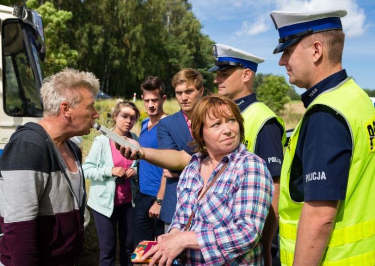 Ende einer Dienstfahrt: Die polnische Polizei lässt Klaus (Jörg Schüttauf, li.) pusten - mit bösen Folgen. Jule (Karolyna Lodyga, 2. v. li.), Uwe (Sönke Möhring, 3. v. li.), Krzysztow (Piotr Witkowski) und Inge (Marie Gruber, 3. v. re.) sehen schon das Unglück kommen.