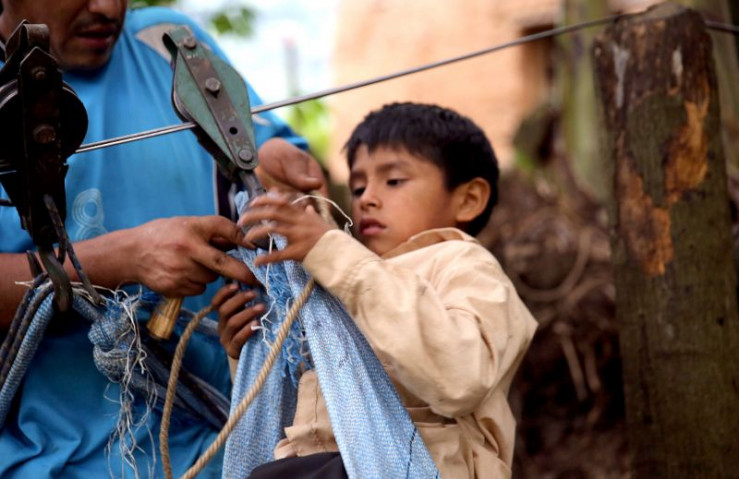 Die Zipline spannt sich 300 Meter über das Tal. Es gibt zwei Ziplines, eine für den Hin-, eine für den Rückweg. Sie starten auf unterschiedlichen Höhen, damit die Familie genug Schwung und Geschwindigkeit für die Überfahrt bekommt. Die Zipline ist über 30 Jahre alt und hängt stark durch. Das Kabel hängt in 200 Metern Höhe.